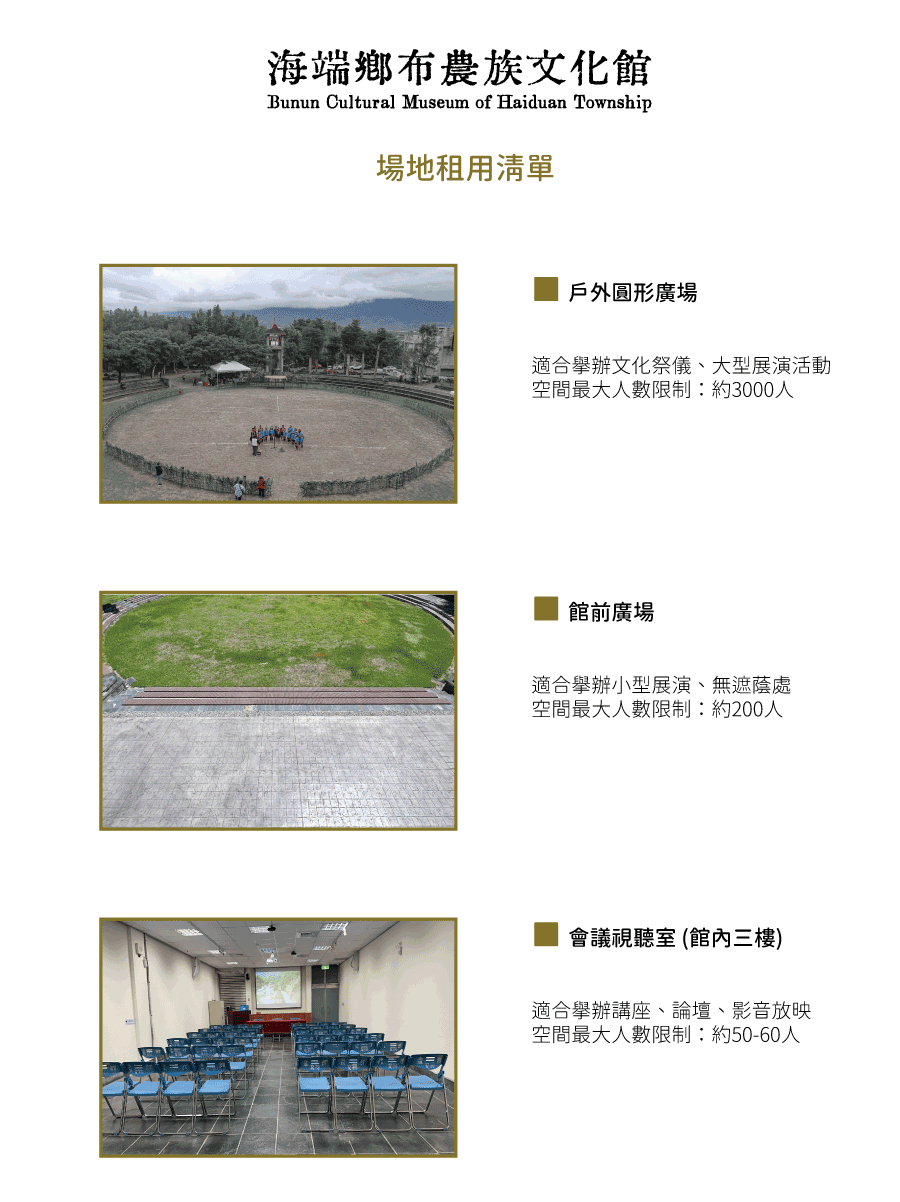 租借方應於使用日7天前與館方協商使用場地之佈置、接待及安全措施、海報張貼…等細節事項,以便館方能預先掌握與協助。